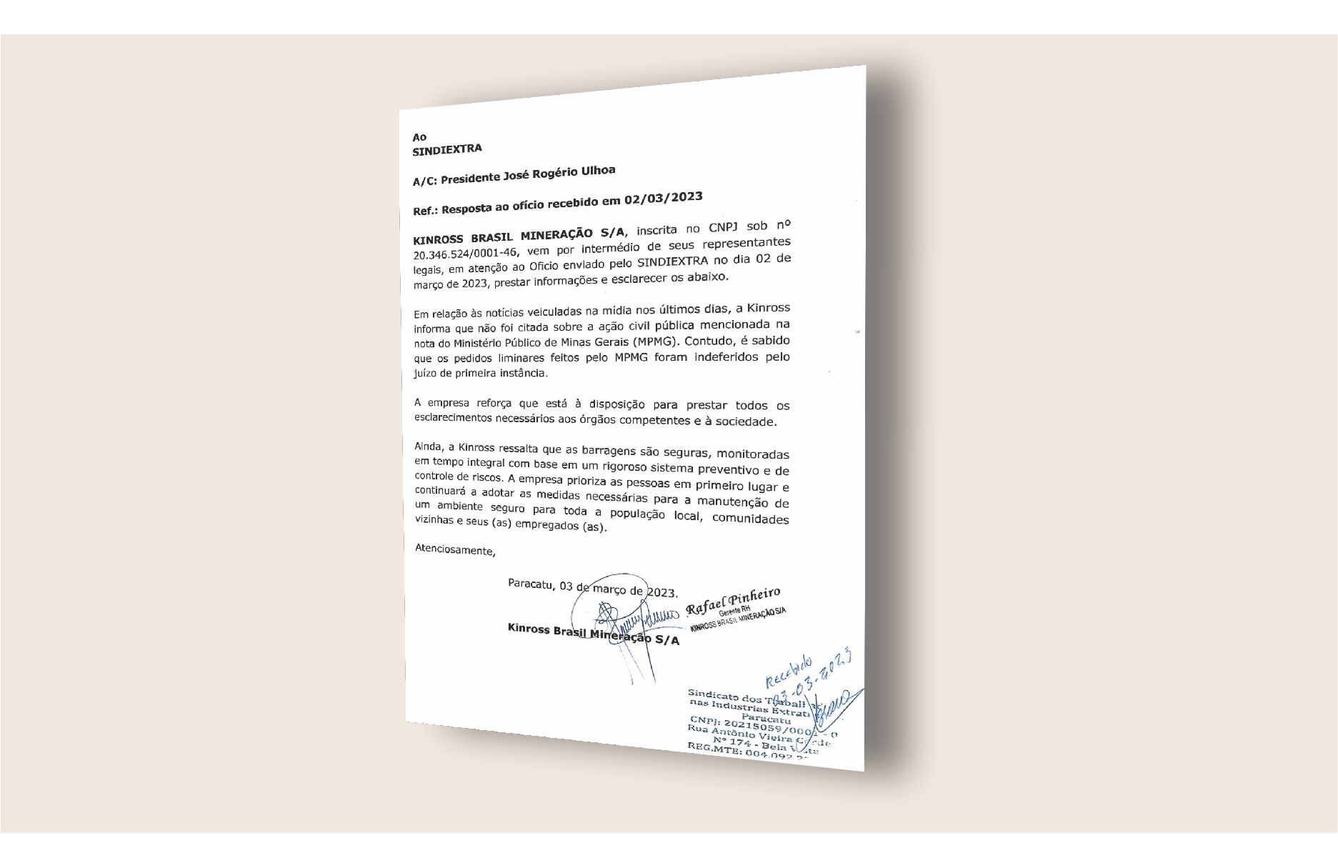 O SINDIEXTRA solicitou à direção da Kinross, através de ofício, informações sobre as repercussões de “Ação Civil Pública com Pedido…